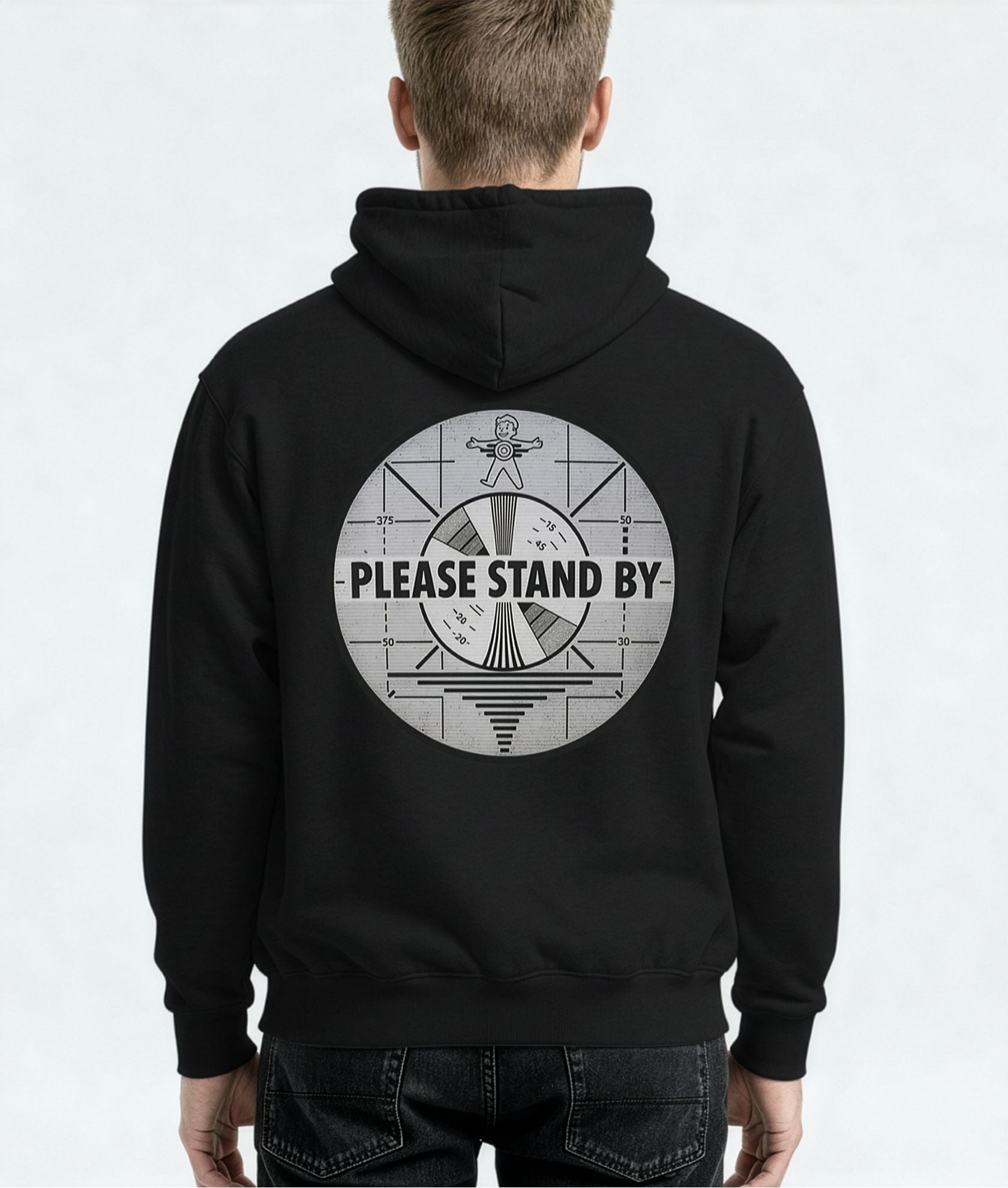 Broadcasted across the surface and vaults alike, this hoodie calls on the iconic imagery of the post-apocalyptic wasteland: the smiling face of the Pip-Boy on the front, and the unmistakable “PLEASE STAND BY” TV test-pattern transmission on the back. It’s a badge of survival, a tribute to the lone wanderer in a radioactive world.